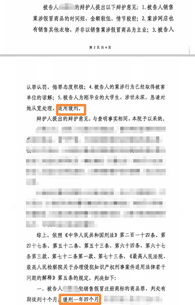 当事人涉嫌销售假冒注册商标的商品罪,我所陈律师介入后,为当事人争取被害单位谅解,并引导当事人认罪认罚,主张情节轻微等,最终为当事人争取缓刑。