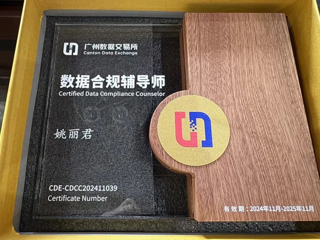 本所合伙人律师姚丽君于2024年11月参加广州数据交易所组织的数据合规培训班,经过广州数据交易所邀请数据合规领域专家的面授培训,并在小组实践考核项目中被评为优秀小组和优秀学员。近日,姚丽君律师通过考核测评正式入库广州数据交易所“数据合规辅导师”。