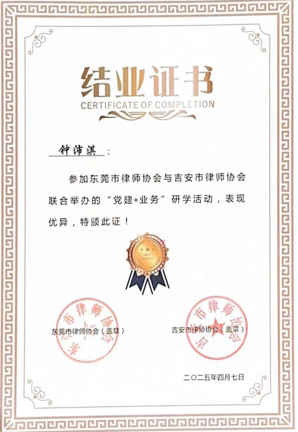 ▲钟沛淇律师结业证书